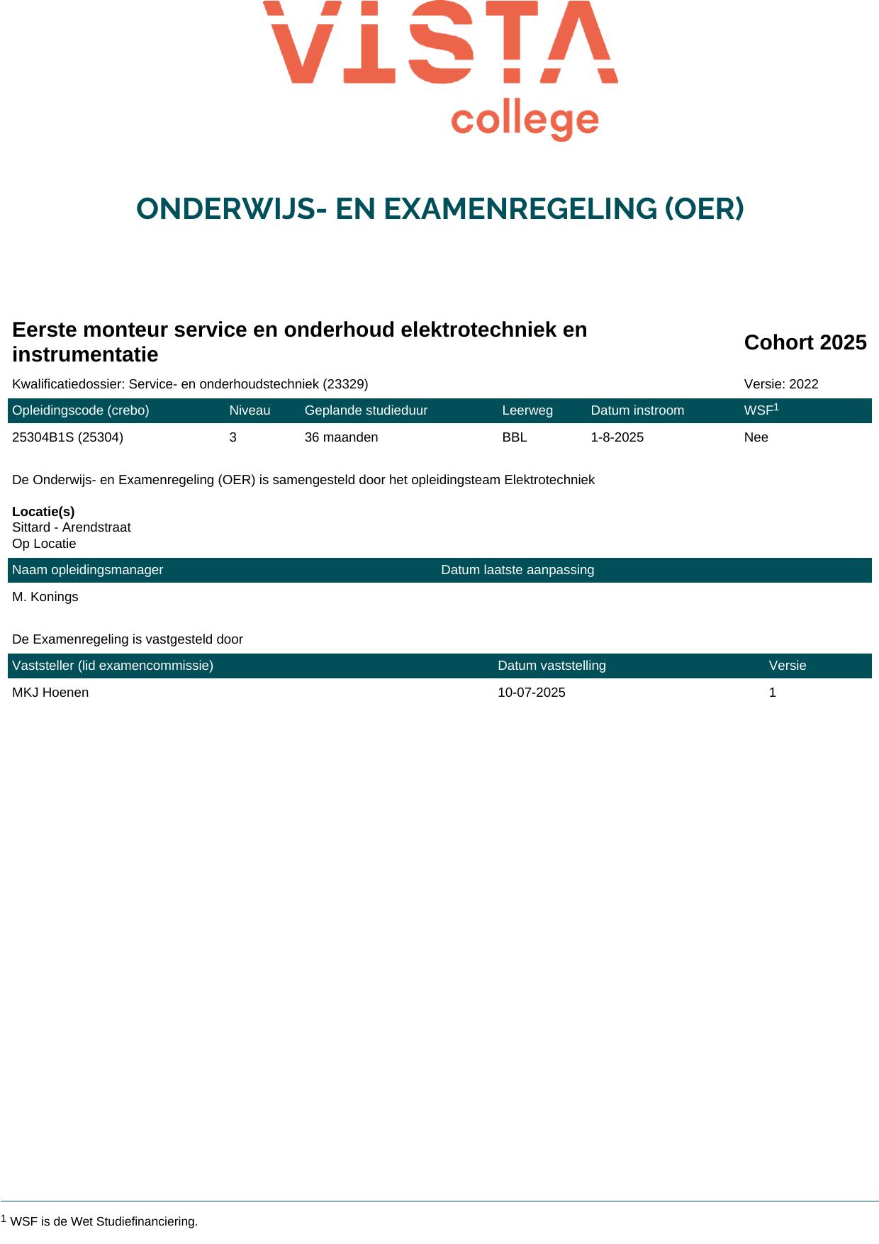 Eerste monteur service en onderhoud elektrotechniek en instrumentatie 25304B1S in cohort 2025-2026