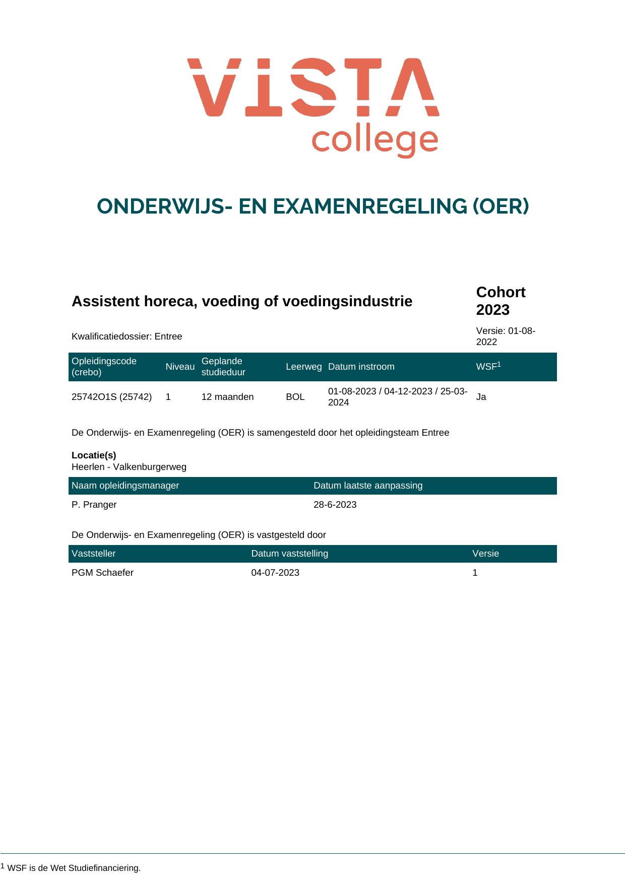 Assistent horeca, voeding of voedingsindustrie 25742O1S in cohort 2023-2024