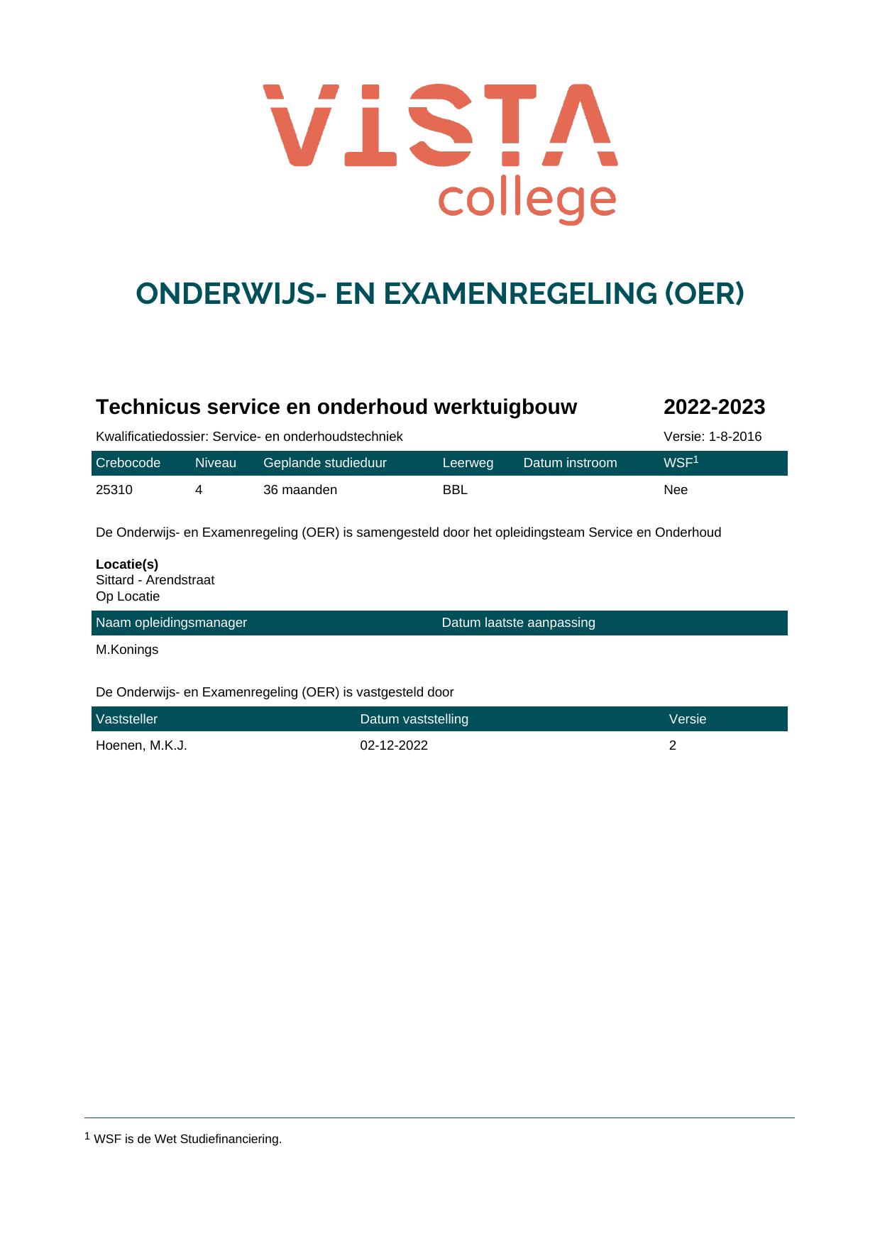 Technicus service en onderhoud werktuigbouw 25310B1S in cohort 2022-2023