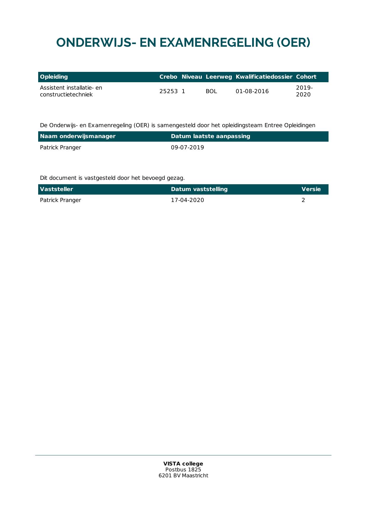 Assistent installatie- en constructietechniek 25253O1S in cohort 2019-2020