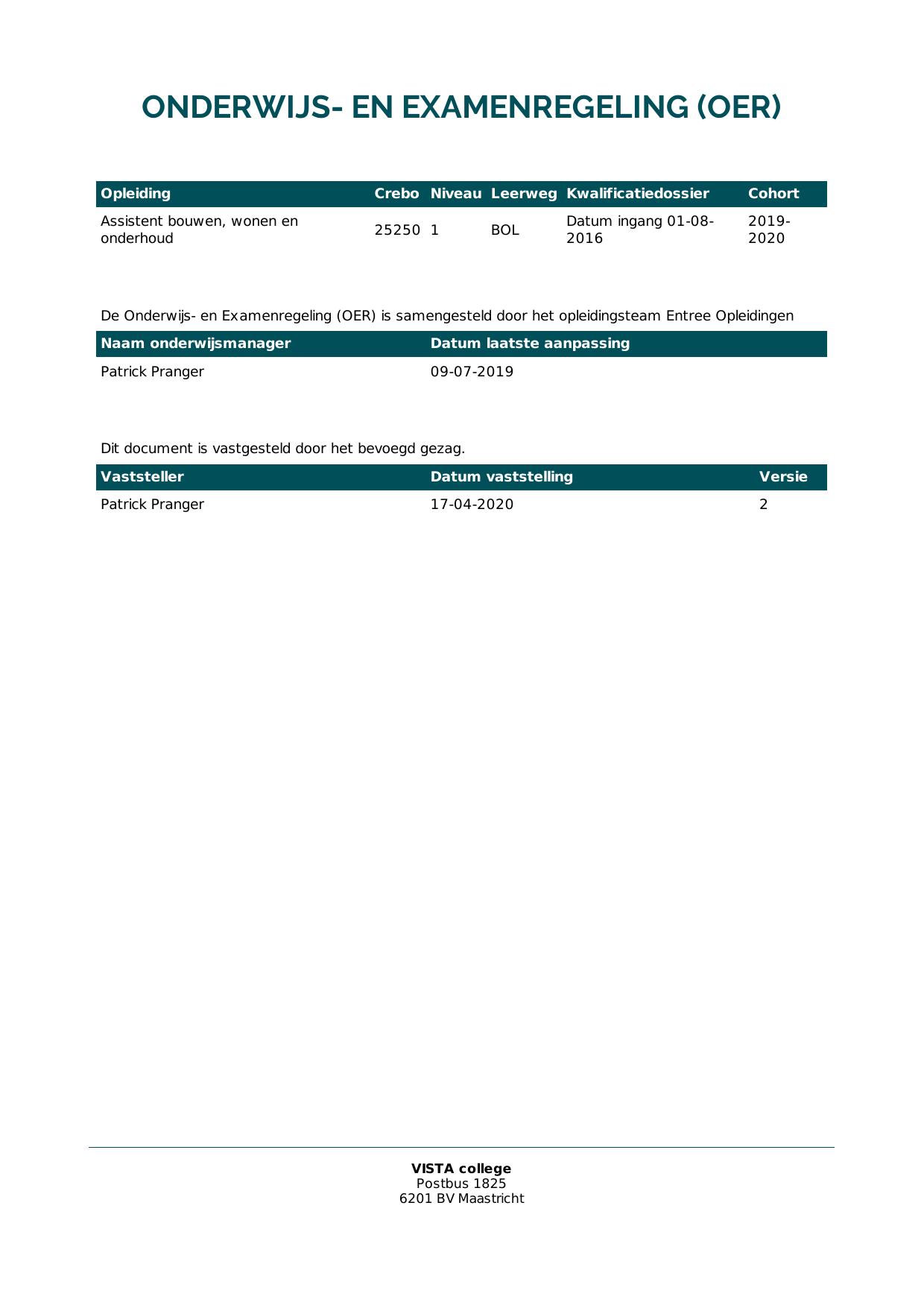 Assistent bouwen, wonen en onderhoud 25250O1S in cohort 2019-2020
