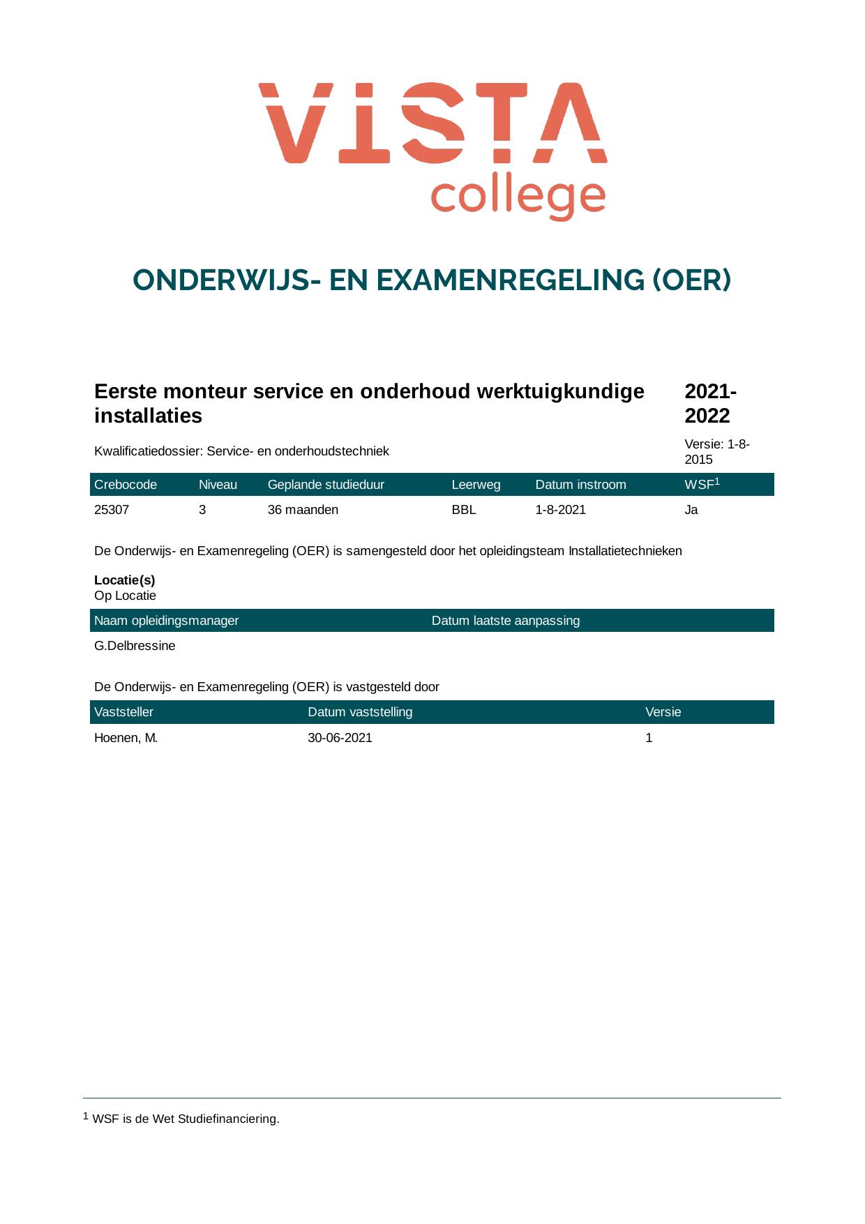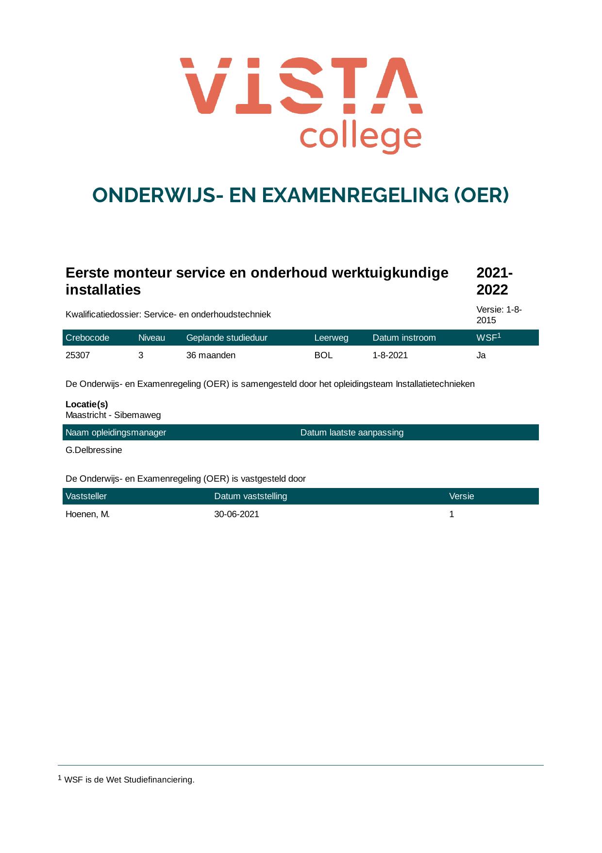 Eerste monteur service en onderhoud werktuigkundige installaties 25307O1S in cohort 2021-2022